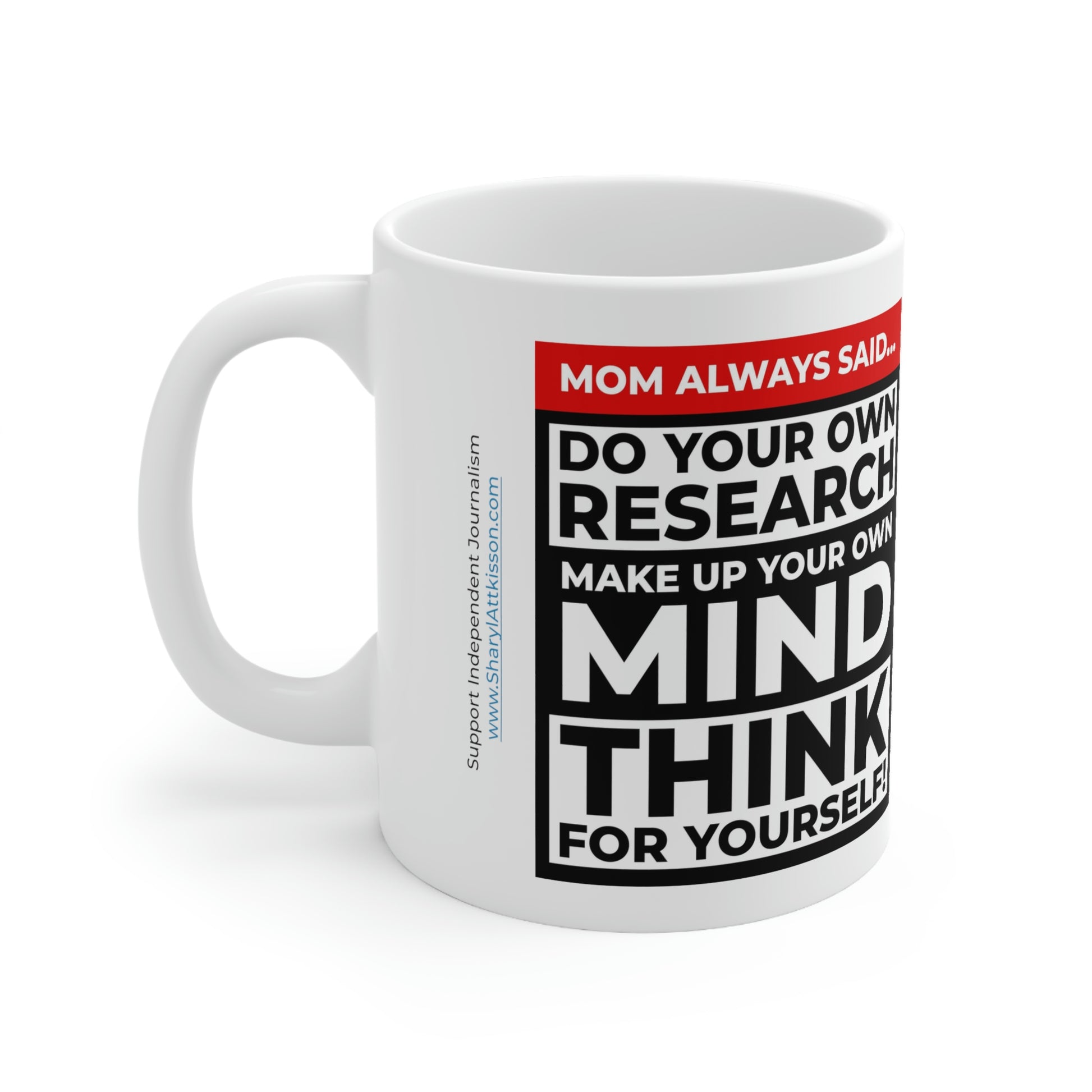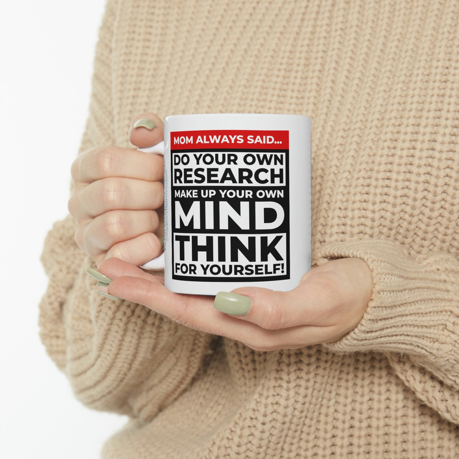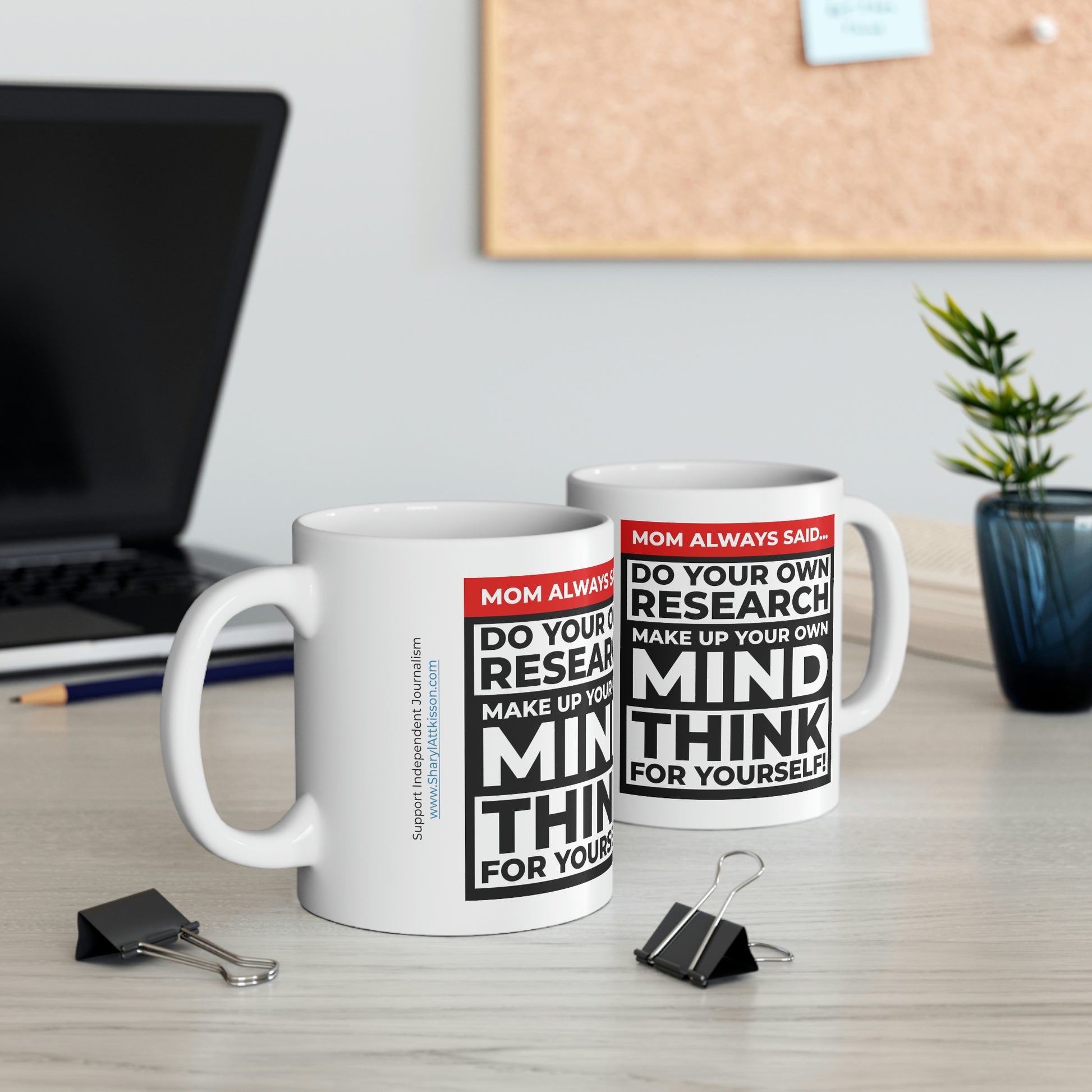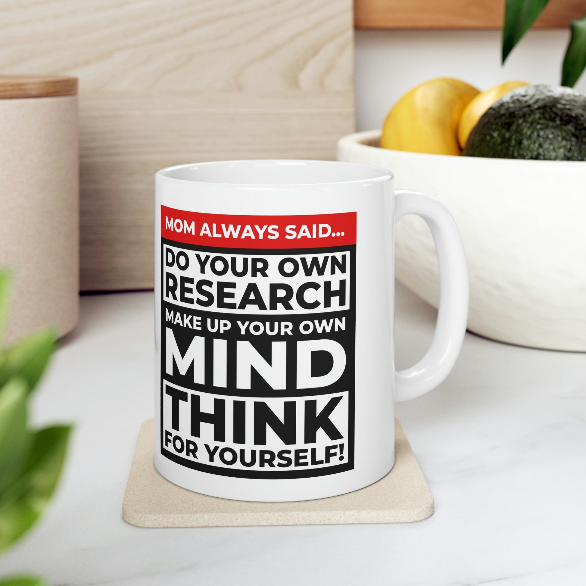 Show you're an independent thinker with this mug that reads "Mom always said: Do your own research. Make up your mind. Think for yourself." It's also a great gift for any free thinkers among your family and friends. Support independent journalism and let people know where you stand.