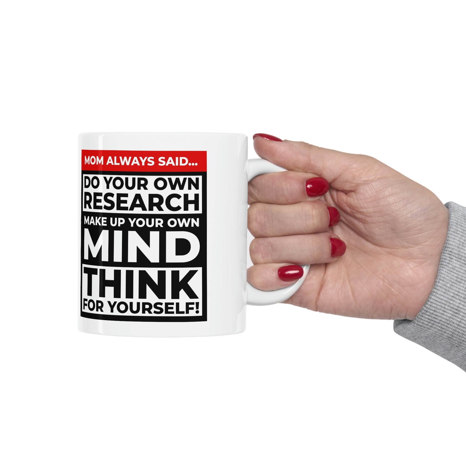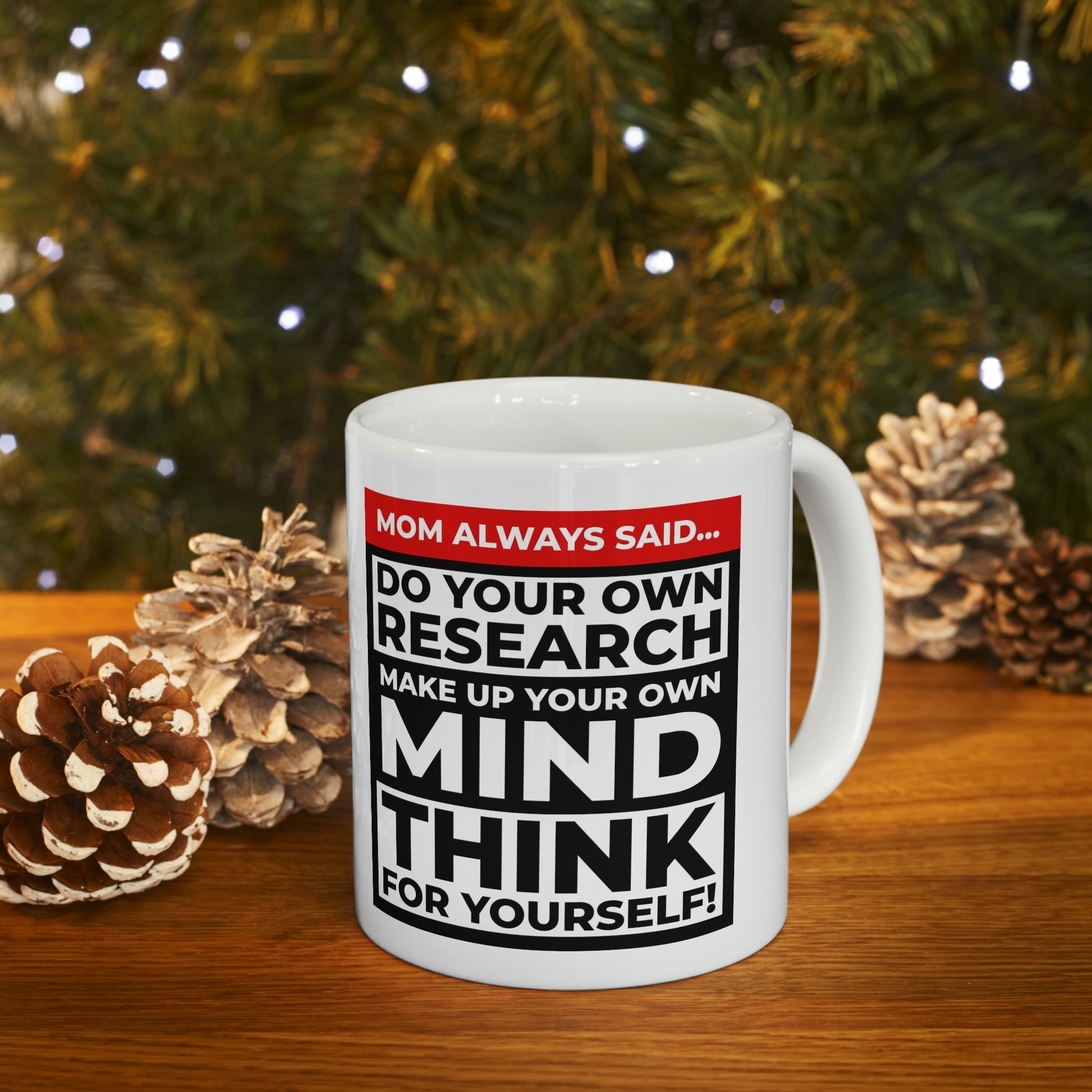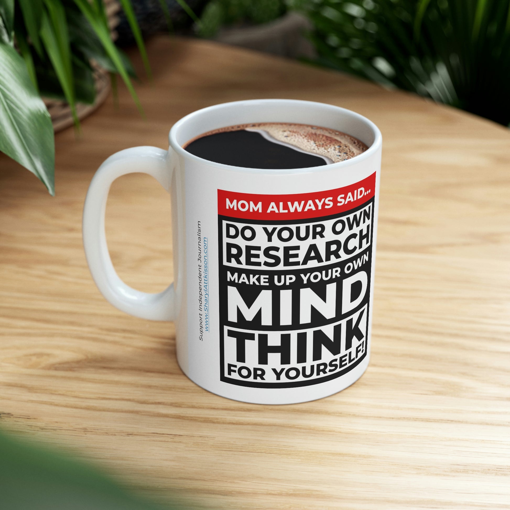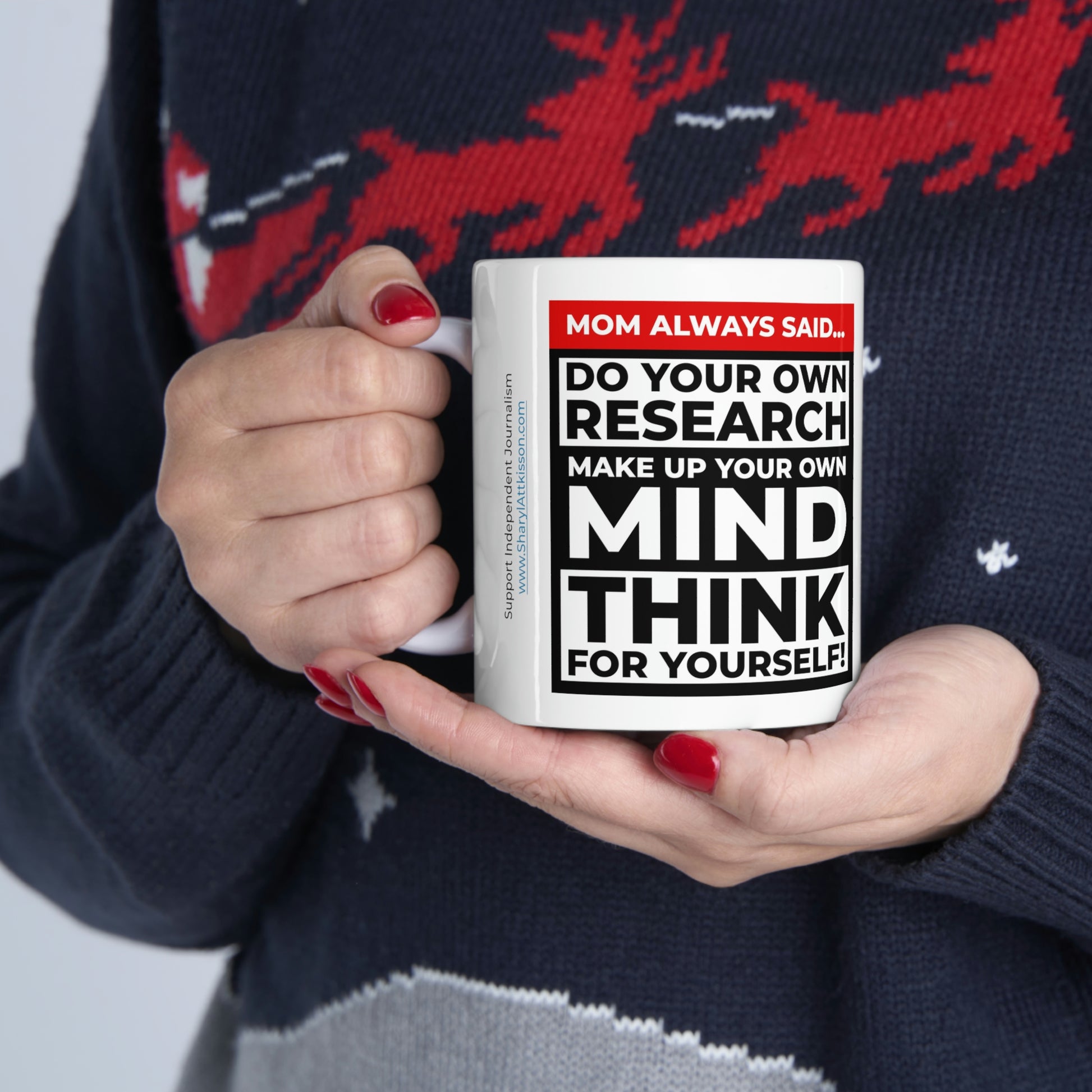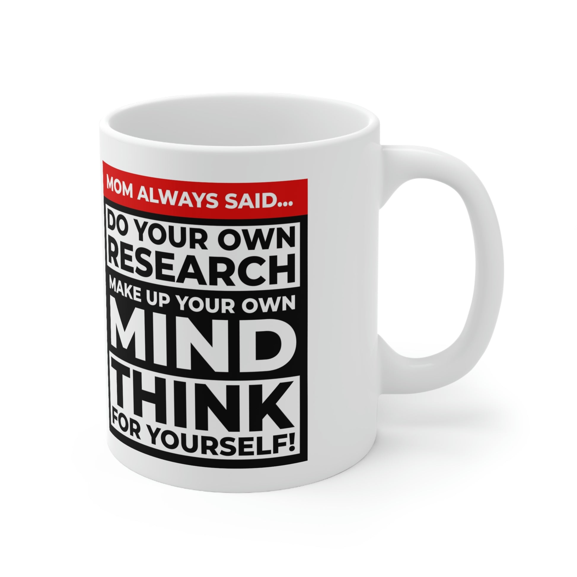 Show you're an independent thinker with this mug that reads "Mom always said: Do your own research. Make up your mind. Think for yourself." It's also a great gift for any free thinkers among your family and friends. Support independent journalism and let people know where you stand.