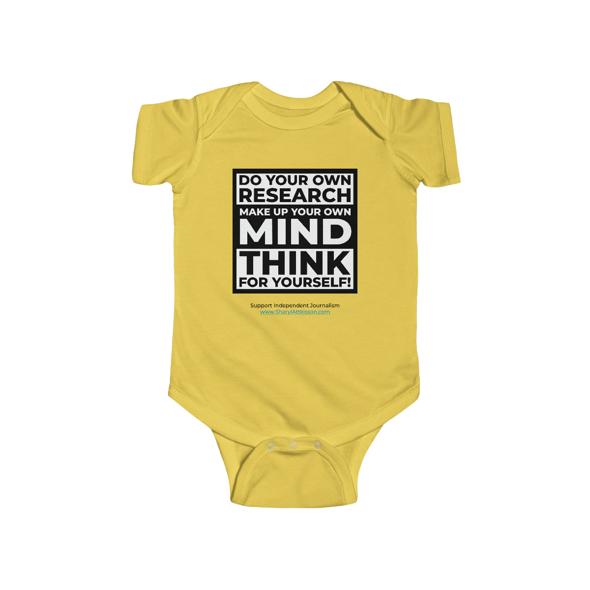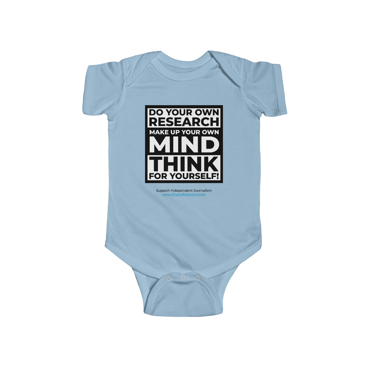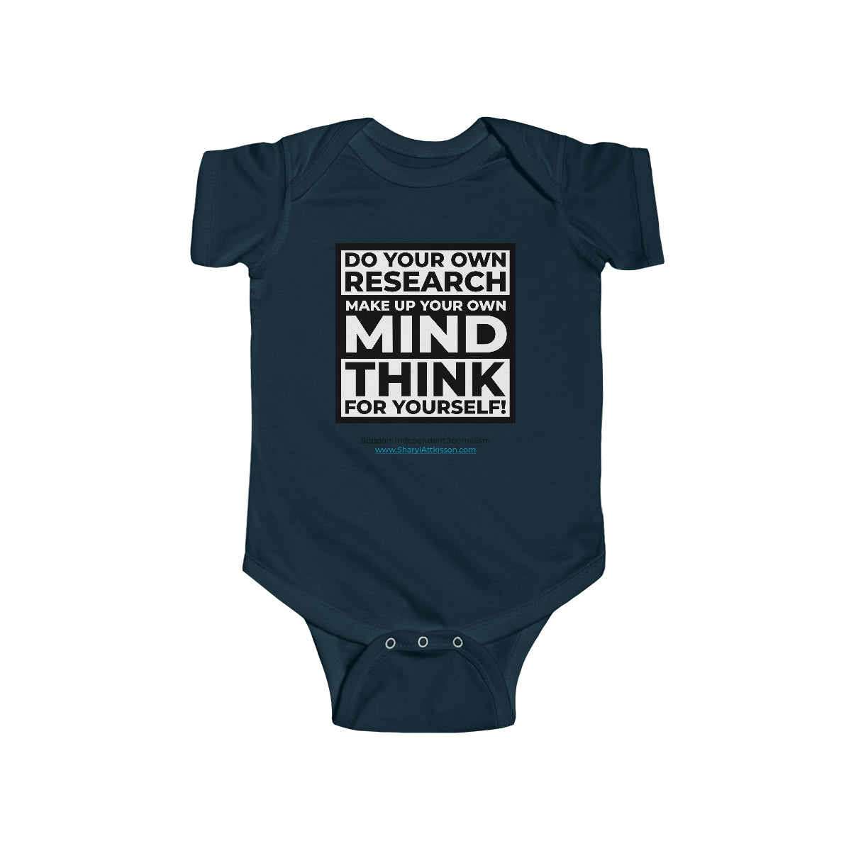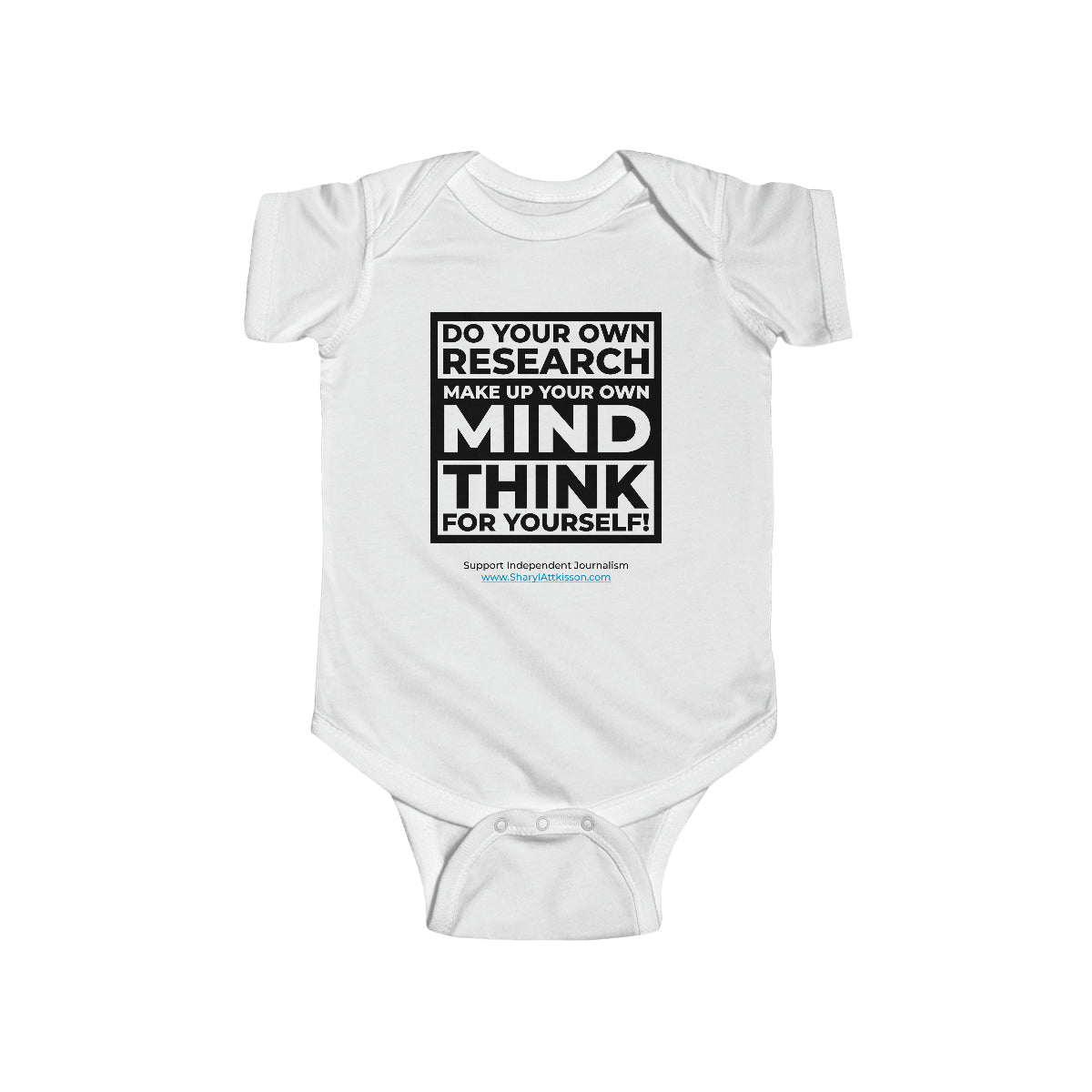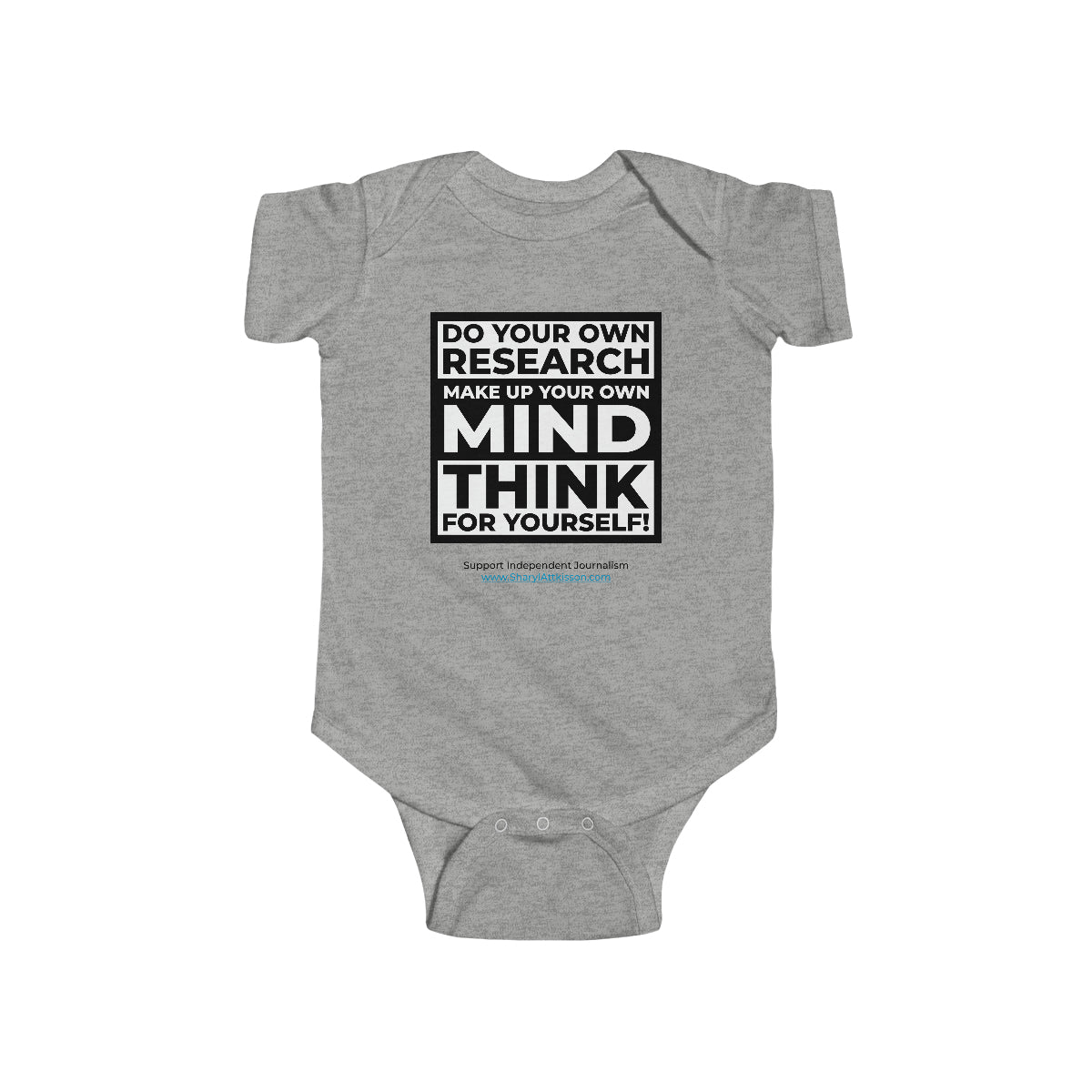 It's never too early to teach how important it is to "Do your own research, Make up your own mind, Think for yourself." This onesie for infants is soft, stylish, and smart. It's an original baby gift nobody else will be giving but you! Browse through our collection for coordinating products for Mom and Dad!