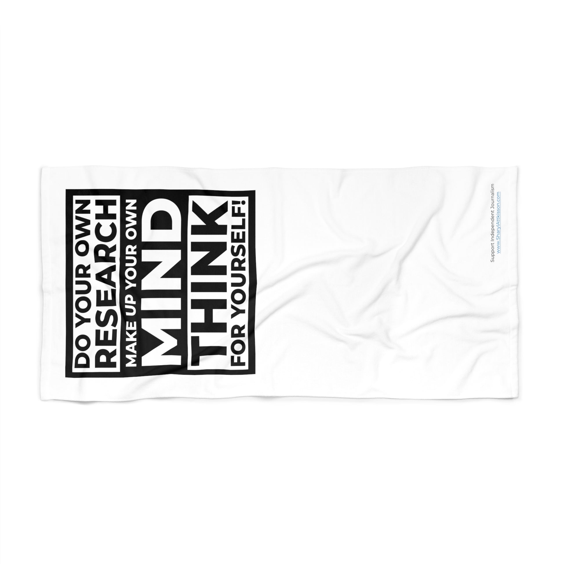 Make a statement with this beach towel featuring the Sharyl Attkisson motto and tagline: "Do your own research, make up your own mind, think for yourself." The towel is silky soft and thick, perfect for the pool or beach. Sized at 2 1/2' x 5'.