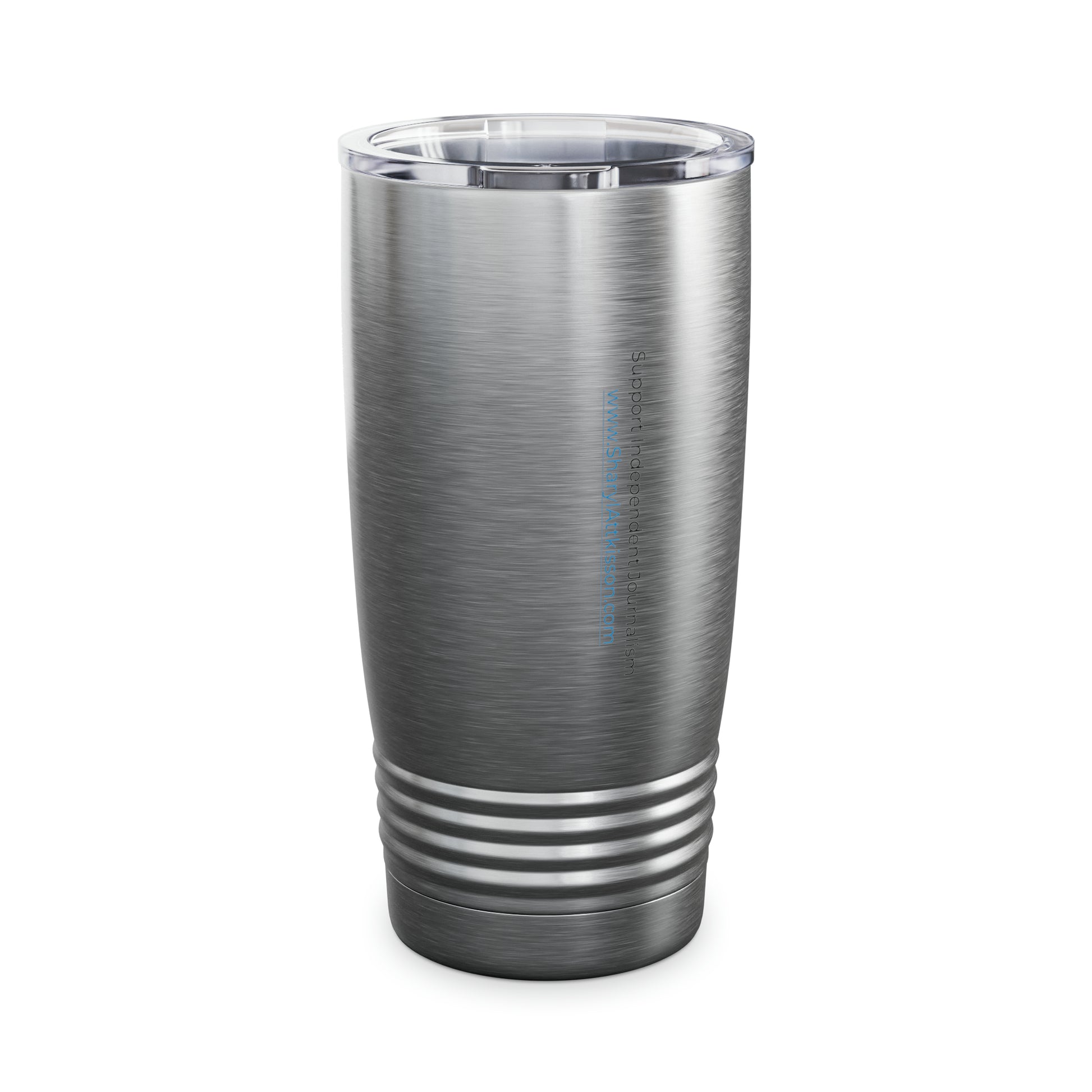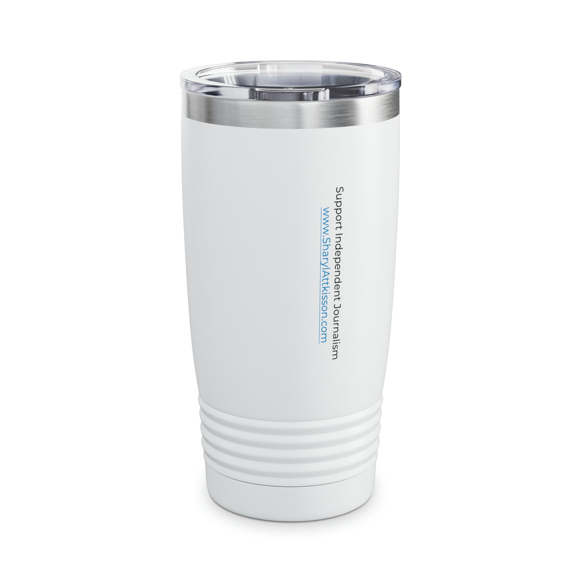 Our custom 20oz tumbler features Sharyl Attkisson's tagline: "Do your own research, make up your own mind, think for yourself." You'll want to carry your hot or cold drinks anywhere in this spacious vesseel that has a double-wall, stainless steel construction for high-end insulation and durability. It comes with a clear, push-on plastic lid to make sipping a breeze on the go while the ribbed bottom provides an optimized, steady grip. Choose between 2 styles: Steel or White.